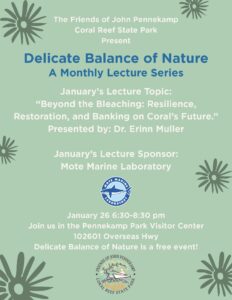 The pre-lecture reception begins at 6:30 pm followed by the lecture at 7:30 pm. Oceanside. There is no charge to attend the reception or program. Our guest speaker is Dr. Erinn Muller, Associate Vice President for Research, Senior Scientist, and the Coral Health and Disease Program Manager at Mote Marine Laboratory in Sarasota, Florida. Dr. Muller’s topic is “Beyond the Bleaching: Resilience, Restoration, and Banking on Corals Future.” She will share research findings on recent stress events impacting Florida’s coral reef with a focus on threatened coral species. Dr. Muller will also discuss practical applications of this research for coral restoration and the importance of Mote’s International Coral Gene Bank. For more information or additional accessibility needs, contact Elena Muratori, Park Services Specialist, at John Pennekamp Coral Reef State Park, at 305-676-3786.